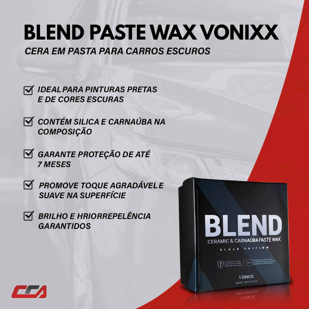 Blend Ceramic & Carnaúba Paste Wax – Black Edition é uma cera híbrida especialmente desenvolvida para carros de cor escura, principalmente os de cor preta. Composta por SiO2 e pela mais pura carnaúba tipo 1, protege a superfície veicular por até sete meses. O produto promove a resistência cerâmica, brilho quente da carnaúba e hidrorrepelência.