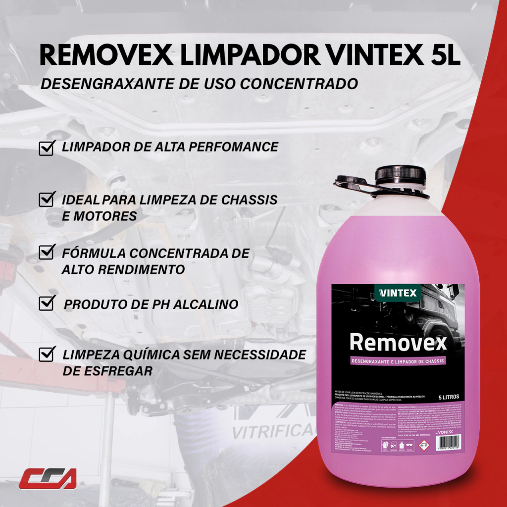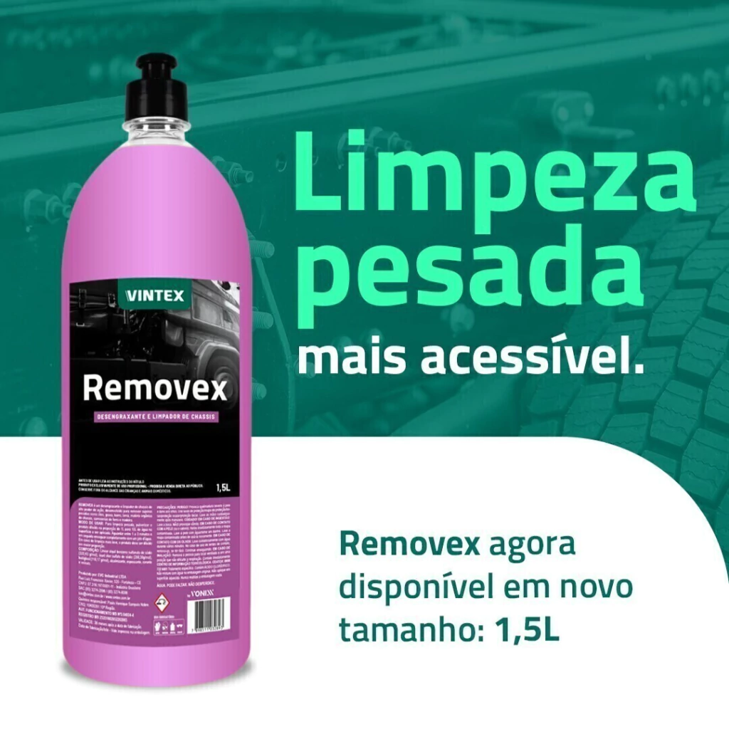 Removex é um desengraxante e limpador de chassi de alto poder de ação, desenvolvido para remover sujeiras pesadas como óleo, graxa, barro, lama, matéria orgânica de chassi, carrocerias de ferro e madeira.
