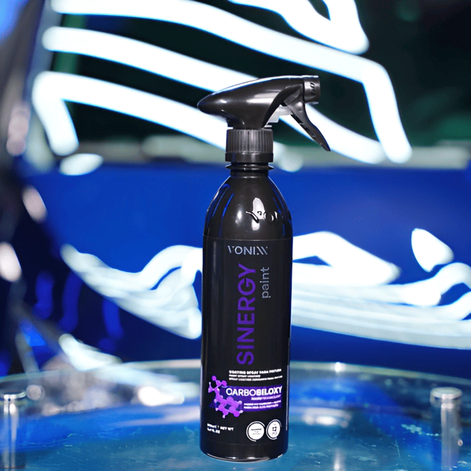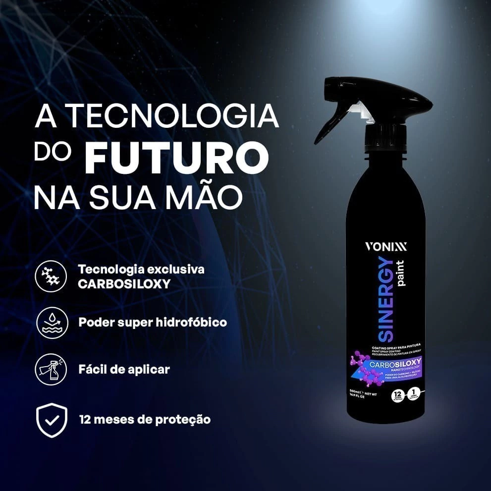 Sinergy é um coating spray de fácil aplicação, desenvolvido para pintura de automóveis e tem como função proteger a pintura por até 12 meses. O diferencial desse produto é a sua tecnologia exclusiva Vonixx, a Carbosiloxy, na qual o elemento químico carbono age em sinergia com o silício e com isso, forma um filme resistente e super hidrofóbico, com um tempo de cura menor, em média 60 minutos.