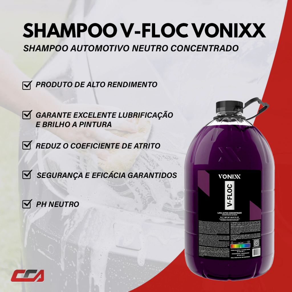 V-Floc é um lava autos de alta performance e de pH neutro. Sua fórmula contém agentes condicionadores e tensoativos especiais que proporcionam uma lavagem suave e eficiente. V-Floc tem alto grau de lubrificação, promovendo redução significativa do coeficiente de atrito, proporcionando um melhor deslize da luva de microfibra e reduzindo de forma efetiva as chances de microrriscos na pintura. V-Floc também promove brilho e aspecto de renovação da pintura.
